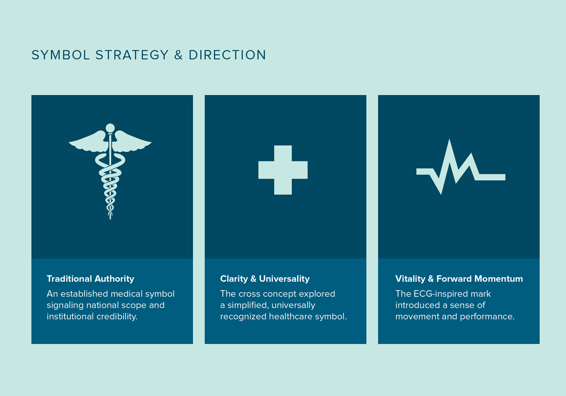 Rather than defaulting to generic medical iconography, the identity exploration examined three visual territories: traditional authority, universal healthcare symbolism, and forward-driven performance.